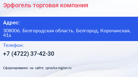 Эрфогель, торговая компания по адресу 308006, Белгородская область, Белгород, Корочанская, 41а в дальнейшем Организация, размещена в следующих категориях:
