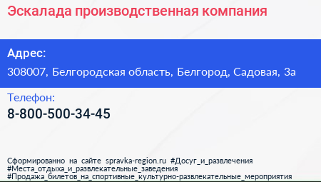 Эскалада, производственная компания по адресу 308007, Белгородская область, Белгород, Садовая, 3а в дальнейшем Организация, размещена в следующих категориях: