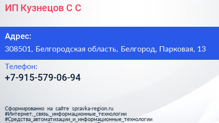 ИП Кузнецов С.С. по адресу 308501, Белгородская область, Белгород, Парковая, 13 в дальнейшем Организация, размещена в следующих категориях: