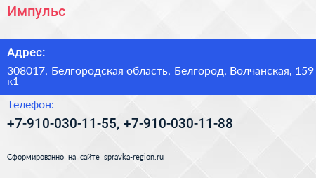Импульс по адресу 308017, Белгородская область, Белгород, Волчанская, 159 к1 в дальнейшем Организация, размещена в следующих категориях: