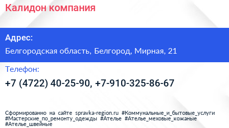Калидон, компания по адресу Белгородская область, Белгород, Мирная, 21 в дальнейшем Организация, размещена в следующих категориях: