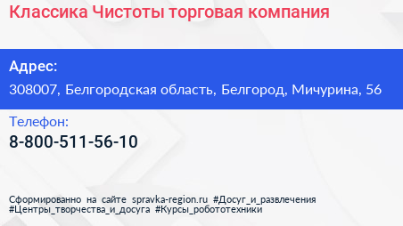 Классика Чистоты, торговая компания по адресу 308007, Белгородская область, Белгород, Мичурина, 56 в дальнейшем Организация, размещена в следующих категориях: