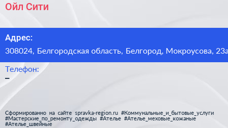 Ойл-Сити по адресу 308024, Белгородская область, Белгород, Мокроусова, 23а в дальнейшем Организация, размещена в следующих категориях: