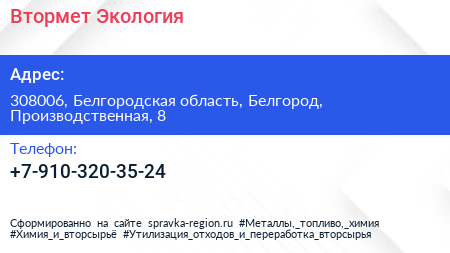 Втормет-Экология по адресу 308006, Белгородская область, Белгород, Производственная, 8 в дальнейшем Организация, размещена в следующих категориях: