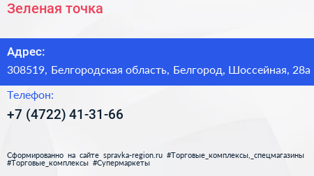 Зеленая точка по адресу 308519, Белгородская область, Белгород, Шоссейная, 28а в дальнейшем Организация, размещена в следующих категориях: