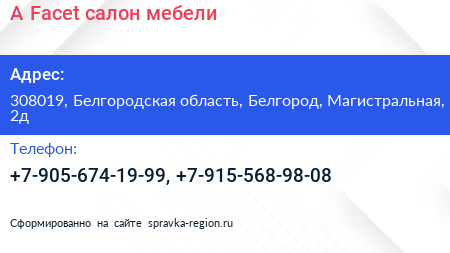 A. Facet, салон мебели по адресу 308019, Белгородская область, Белгород, Магистральная, 2д в дальнейшем Организация, размещена в следующих категориях: