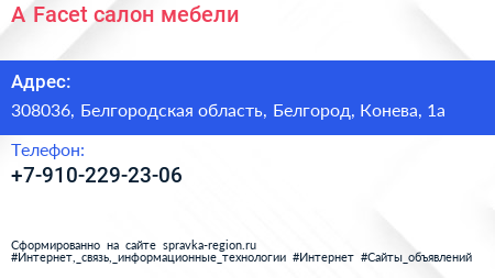A. Facet, салон мебели по адресу 308036, Белгородская область, Белгород, Конева, 1а в дальнейшем Организация, размещена в следующих категориях: