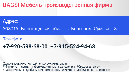 BAGSI Мебель, производственная фирма по адресу 308015, Белгородская область, Белгород, Сумская, 8 в дальнейшем Организация, размещена в следующих категориях: