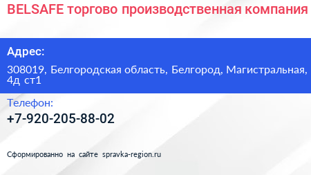 BELSAFE, торгово-производственная компания по адресу 308019, Белгородская область, Белгород, Магистральная, 4д ст1 в дальнейшем Организация, размещена в следующих категориях: