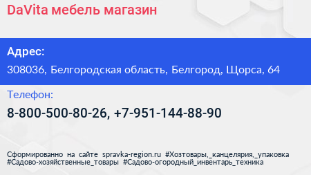 DaVita-мебель, магазин по адресу 308036, Белгородская область, Белгород, Щорса, 64 в дальнейшем Организация, размещена в следующих категориях: