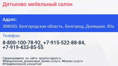 Дятьково, мебельный салон по адресу 308020, Белгородская область, Белгород, Донецкая, 85а в дальнейшем Организация, размещена в следующих категориях:
