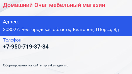 Домашний Очаг, мебельный магазин по адресу 308027, Белгородская область, Белгород, Щорса, 8д в дальнейшем Организация, размещена в следующих категориях: