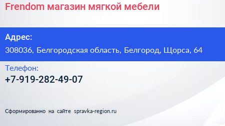 Frendom, магазин мягкой мебели по адресу 308036, Белгородская область, Белгород, Щорса, 64 в дальнейшем Организация, размещена в следующих категориях: