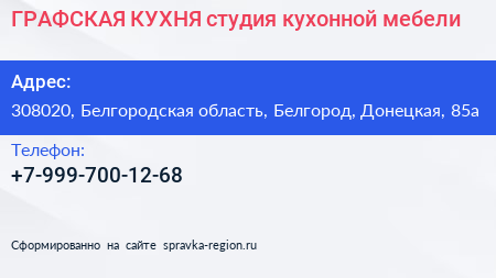 ГРАФСКАЯ КУХНЯ, студия кухонной мебели по адресу 308020, Белгородская область, Белгород, Донецкая, 85а в дальнейшем Организация, размещена в следующих категориях: