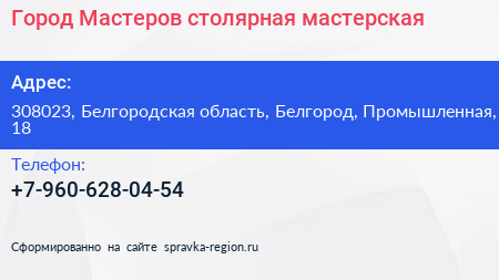 Город Мастеров, столярная мастерская по адресу 308023, Белгородская область, Белгород, Промышленная, 18 в дальнейшем Организация, размещена в следующих категориях:
