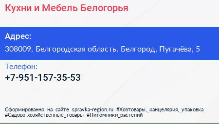 Кухни и Мебель Белогорья по адресу 308009, Белгородская область, Белгород, Пугачёва, 5 в дальнейшем Организация, размещена в следующих категориях: