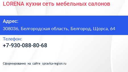 LORENA кухни, сеть мебельных салонов по адресу 308036, Белгородская область, Белгород, Щорса, 64 в дальнейшем Организация, размещена в следующих категориях: