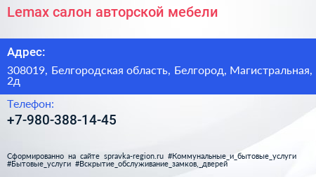 Lemax, салон авторской мебели по адресу 308019, Белгородская область, Белгород, Магистральная, 2д в дальнейшем Организация, размещена в следующих категориях: