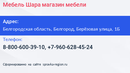 Мебель Шара, магазин мебели по адресу Белгородская область, Белгород, Берёзовая улица, 1Б в дальнейшем Организация, размещена в следующих категориях: