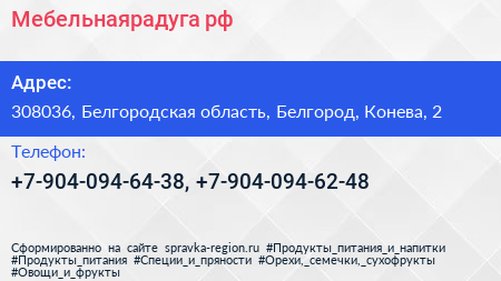 Мебельнаярадуга.рф по адресу 308036, Белгородская область, Белгород, Конева, 2 в дальнейшем Организация, размещена в следующих категориях:
