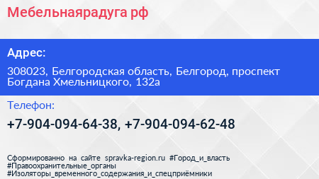 Мебельнаярадуга.рф по адресу 308023, Белгородская область, Белгород, проспект Богдана Хмельницкого, 132а в дальнейшем Организация, размещена в следующих категориях: