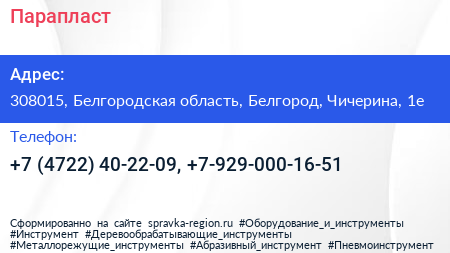 Парапласт по адресу 308015, Белгородская область, Белгород, Чичерина, 1е в дальнейшем Организация, размещена в следующих категориях: