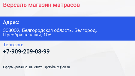 Версаль, магазин матрасов по адресу 308009, Белгородская область, Белгород, Преображенская, 106 в дальнейшем Организация, размещена в следующих категориях: