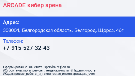 ARCADE, кибер-арена по адресу 308004, Белгородская область, Белгород, Щорса, 46г в дальнейшем Организация, размещена в следующих категориях: