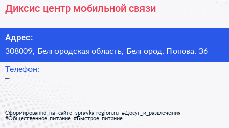 Диксис, центр мобильной связи по адресу 308009, Белгородская область, Белгород, Попова, 36 в дальнейшем Организация, размещена в следующих категориях: