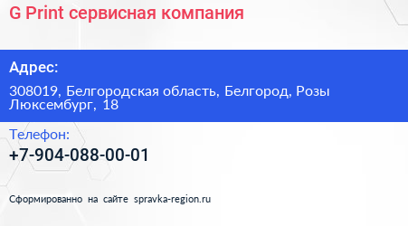 G-Print, сервисная компания по адресу 308019, Белгородская область, Белгород, Розы Люксембург, 18 в дальнейшем Организация, размещена в следующих категориях: