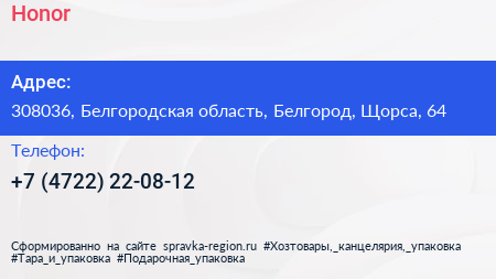 Honor по адресу 308036, Белгородская область, Белгород, Щорса, 64 в дальнейшем Организация, размещена в следующих категориях: