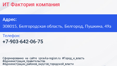 ИТ-Фактория, компания по адресу 308015, Белгородская область, Белгород, Пушкина, 49а в дальнейшем Организация, размещена в следующих категориях: