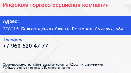 Инфоком, торгово-сервисная компания по адресу 308015, Белгородская область, Белгород, Сумская, 66а в дальнейшем Организация, размещена в следующих категориях: