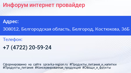 Инфорум, интернет-провайдер по адресу 308012, Белгородская область, Белгород, Костюкова, 36Б в дальнейшем Организация, размещена в следующих категориях: