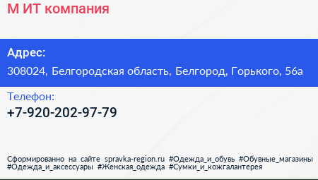 М-ИТ, компания по адресу 308024, Белгородская область, Белгород, Горького, 56а в дальнейшем Организация, размещена в следующих категориях:
