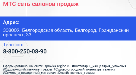 МТС, сеть салонов продаж по адресу 308009, Белгородская область, Белгород, Гражданский проспект, 33 в дальнейшем Организация, размещена в следующих категориях: