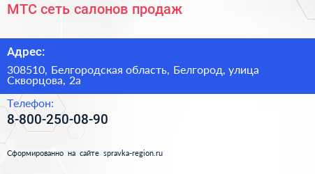 МТС, сеть салонов продаж по адресу 308510, Белгородская область, Белгород, улица Скворцова, 2а в дальнейшем Организация, размещена в следующих категориях:
