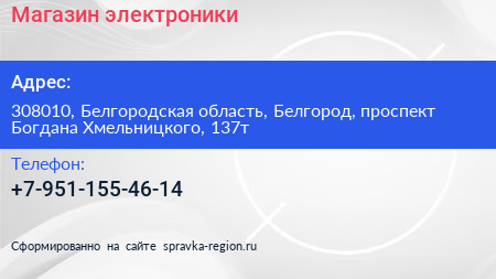 Магазин электроники по адресу 308010, Белгородская область, Белгород, проспект Богдана Хмельницкого, 137т в дальнейшем Организация, размещена в следующих категориях: