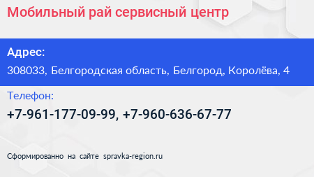 Мобильный рай, сервисный центр по адресу 308033, Белгородская область, Белгород, Королёва, 4 в дальнейшем Организация, размещена в следующих категориях: