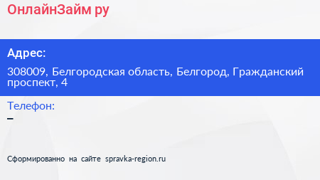 ОнлайнЗайм.ру по адресу 308009, Белгородская область, Белгород, Гражданский проспект, 4 в дальнейшем Организация, размещена в следующих категориях: