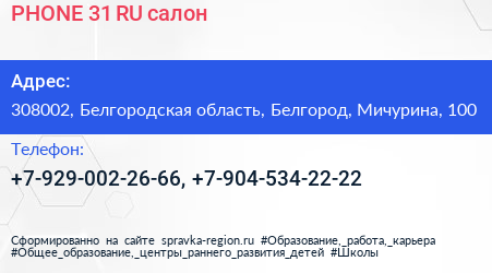 PHONE-31.RU, салон по адресу 308002, Белгородская область, Белгород, Мичурина, 100 в дальнейшем Организация, размещена в следующих категориях: