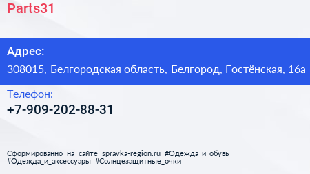 Parts31 по адресу 308015, Белгородская область, Белгород, Гостёнская, 16а в дальнейшем Организация, размещена в следующих категориях: