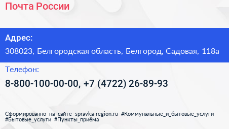 Почта России по адресу 308023, Белгородская область, Белгород, Садовая, 118а в дальнейшем Организация, размещена в следующих категориях: