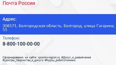 Почта России по адресу 308571, Белгородская область, Белгород, улица Гагарина, 55 в дальнейшем Организация, размещена в следующих категориях: