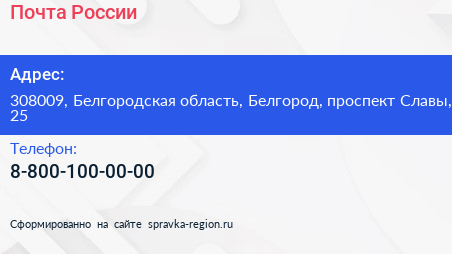 Почта России по адресу 308009, Белгородская область, Белгород, проспект Славы, 25 в дальнейшем Организация, размещена в следующих категориях: