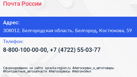 Почта России по адресу 308012, Белгородская область, Белгород, Костюкова, 59 в дальнейшем Организация, размещена в следующих категориях: