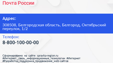 Почта России по адресу 308508, Белгородская область, Белгород, Октябрьский переулок, 1/2 в дальнейшем Организация, размещена в следующих категориях: