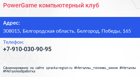 PowerGame, компьютерный клуб по адресу 308015, Белгородская область, Белгород, Победы, 165 в дальнейшем Организация, размещена в следующих категориях: