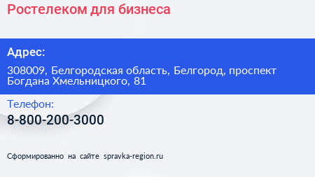 Ростелеком для бизнеса по адресу 308009, Белгородская область, Белгород, проспект Богдана Хмельницкого, 81 в дальнейшем Организация, размещена в следующих категориях: