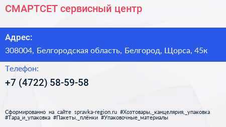 СМАРТСЕТ, сервисный центр по адресу 308004, Белгородская область, Белгород, Щорса, 45к в дальнейшем Организация, размещена в следующих категориях:
